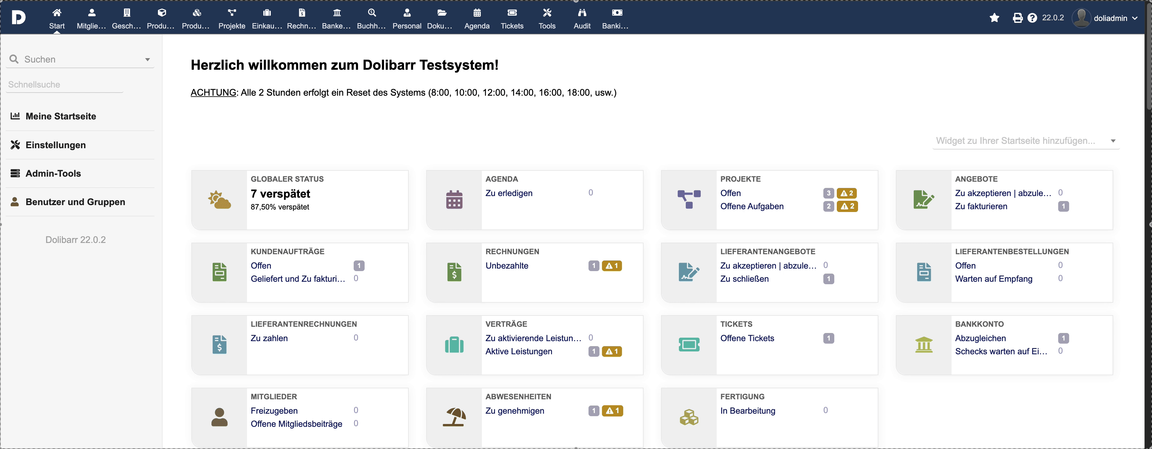 Möchten Sie Dolibarr gleich mal ausprobieren? Ohne lästige Installation, Registrierung oder Wartezeit? Wir betreiben ein kostenloses Testsystem auf das Sie sofort zugreifen können. Einfach hier klicken.
